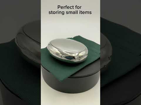The oval box is made of Sterling Silver with a smooth exterior and the hinge built into the side of the box. The lid is opened by putting a fingernail under the edge and it pops up. There’s a clasp to keep the lid shut and soldering around the sides inside from where the top and bottom were joined together when it was made.