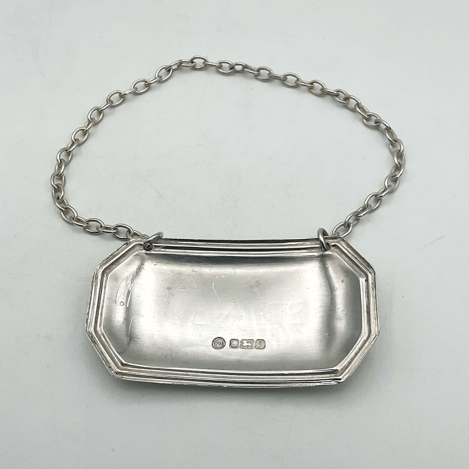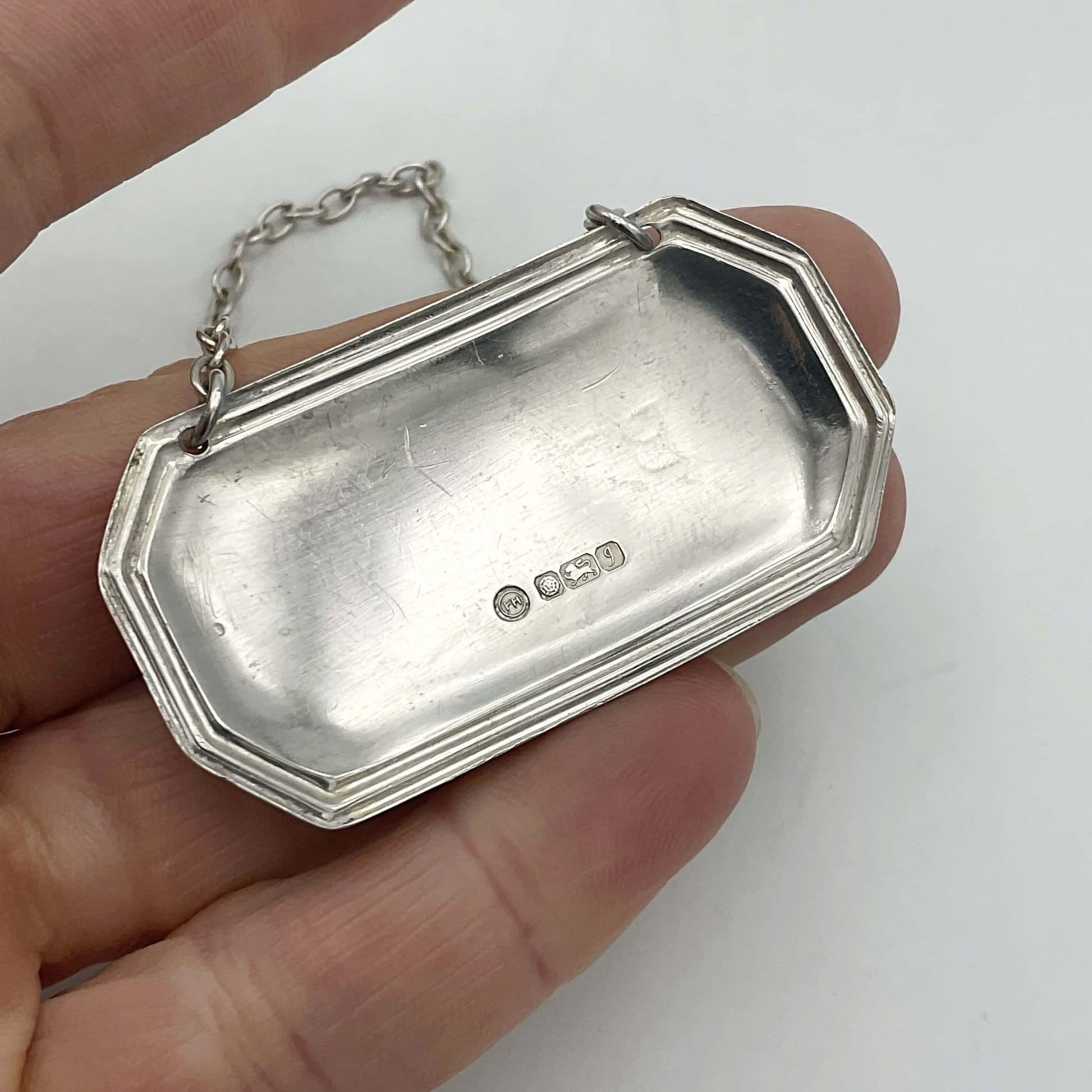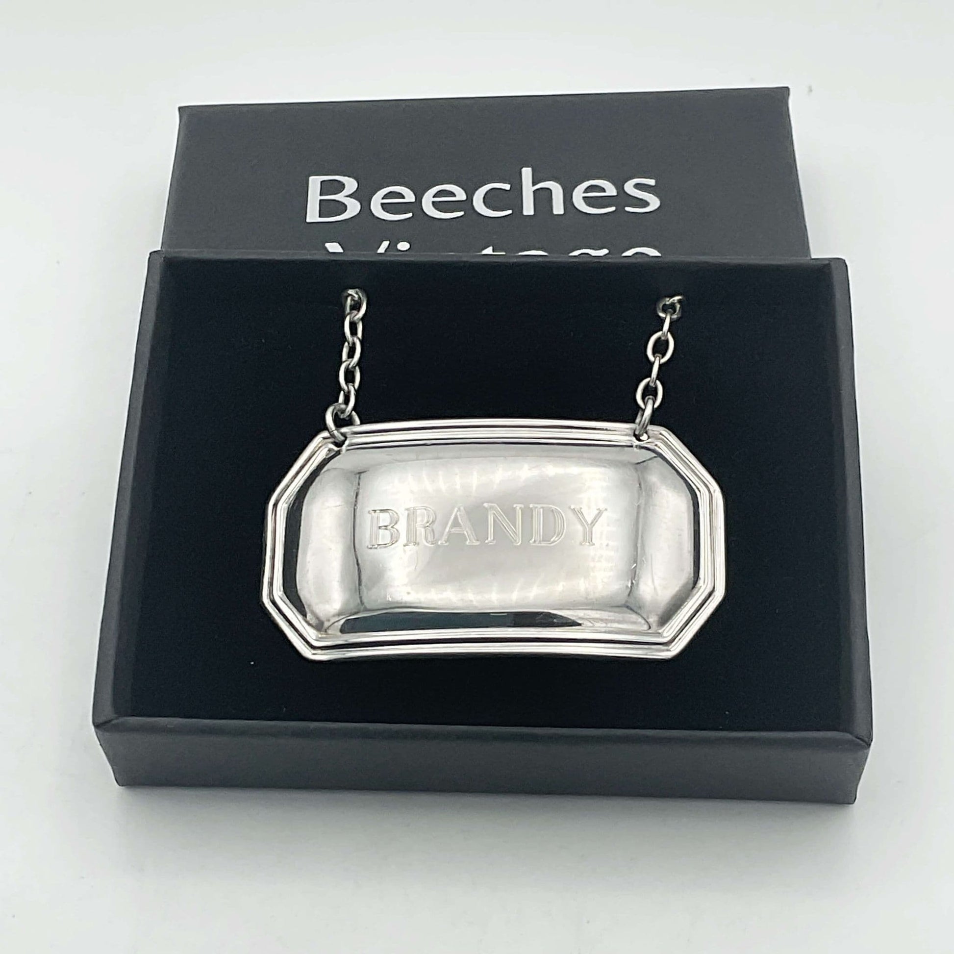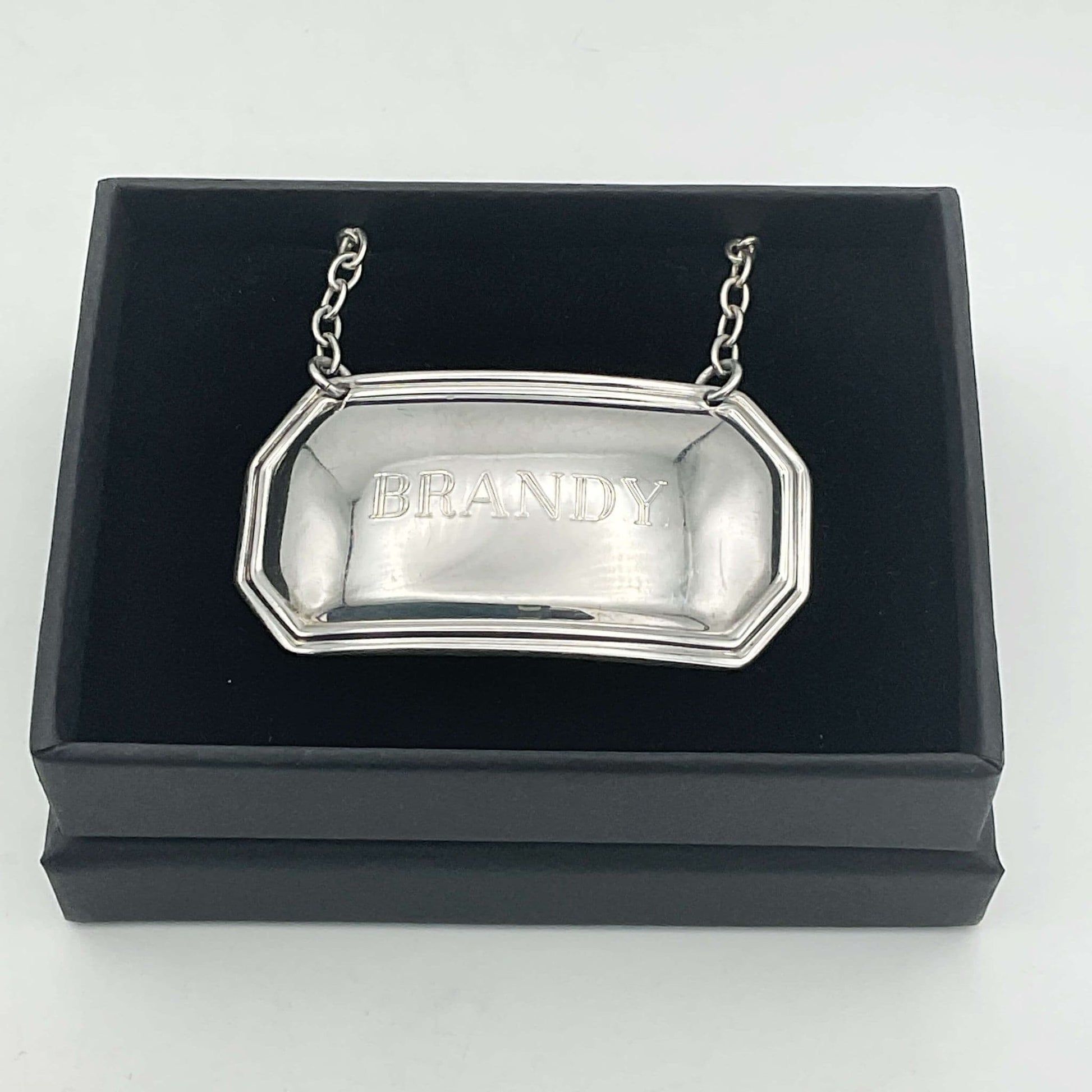 The bottle label or tag is made of shiny solid Sterling Silver and has a pretty lined design around the edge. In the centre of the label it has 'Brandy' engraved and on the back it has the makers mark and hallmarks.