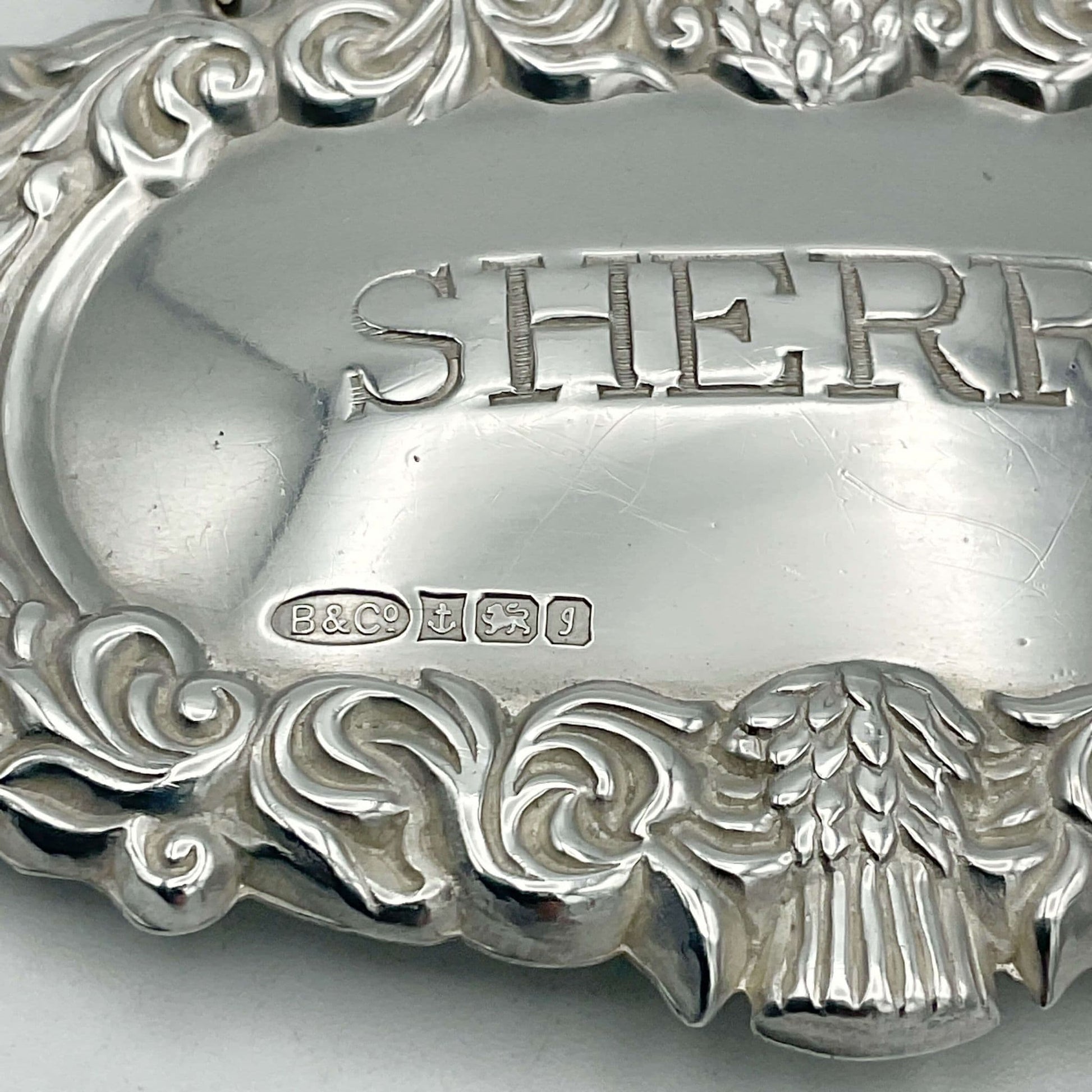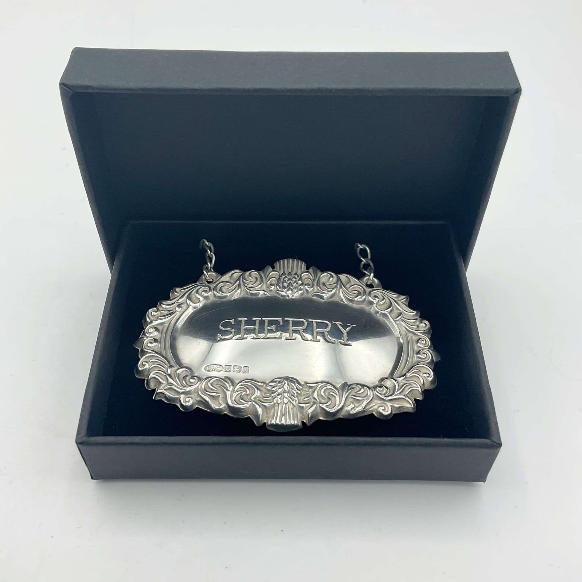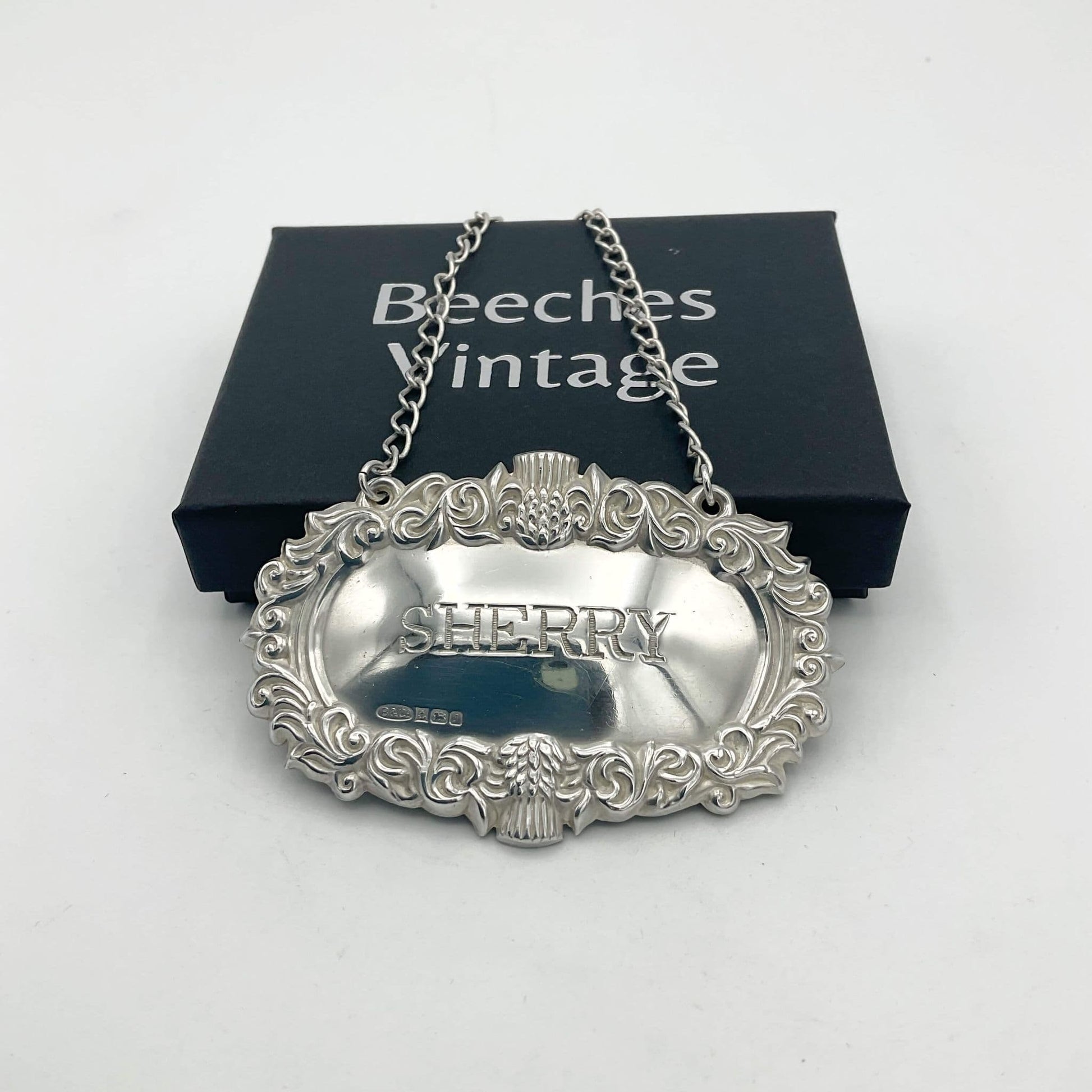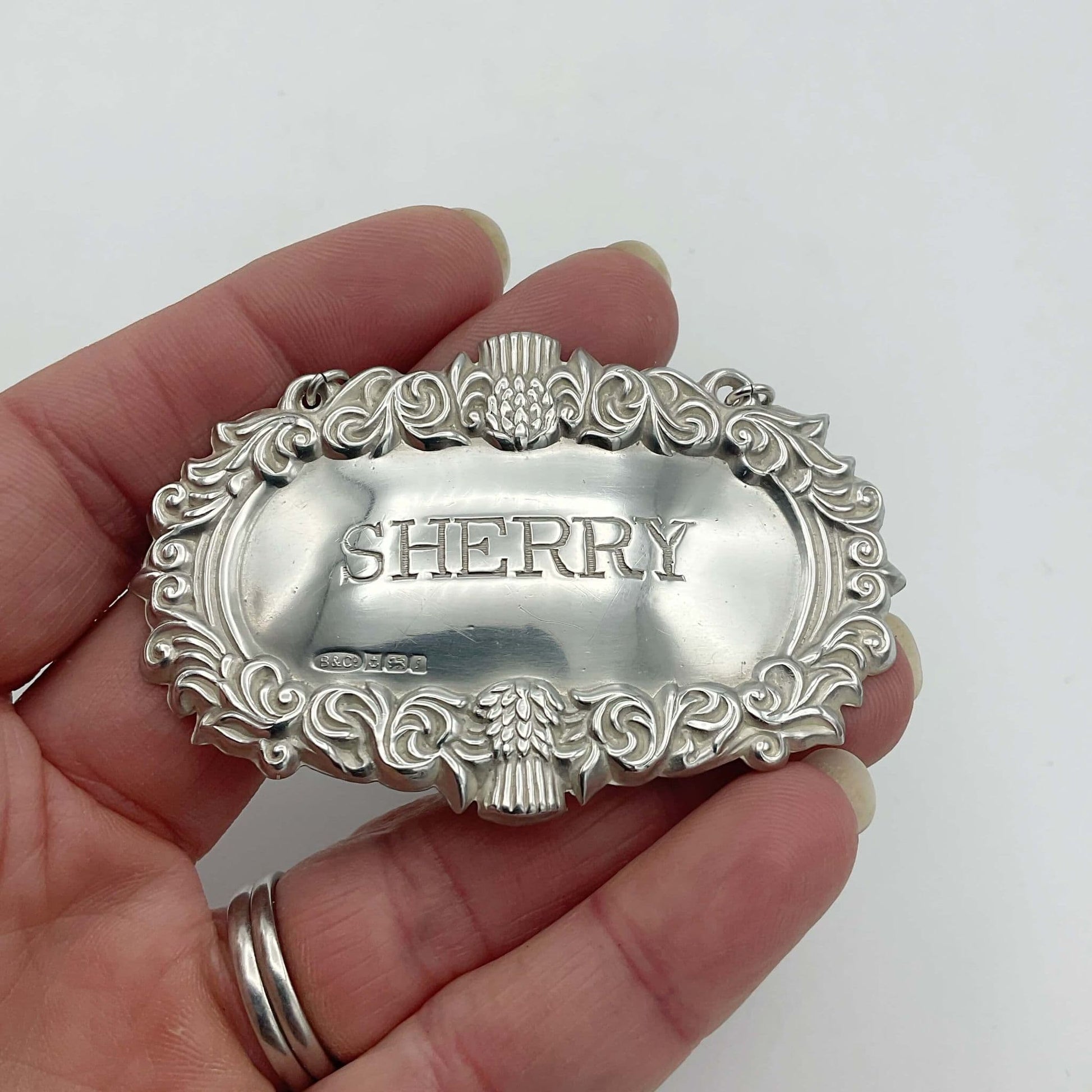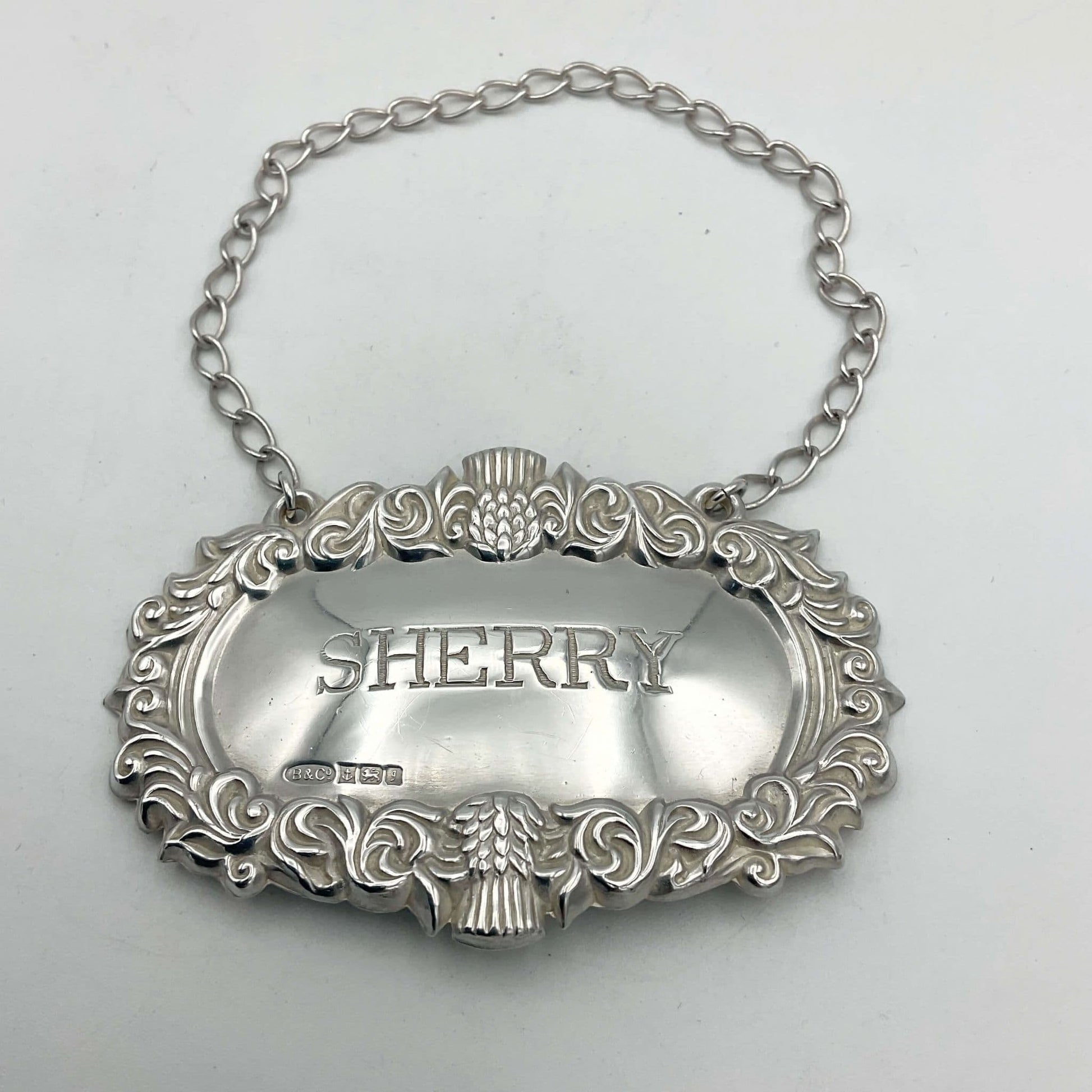The label has a beautiful thistle pattern around the edge with 'Sherry' in the middle of the label and the makers marks and hallmarks on the front.