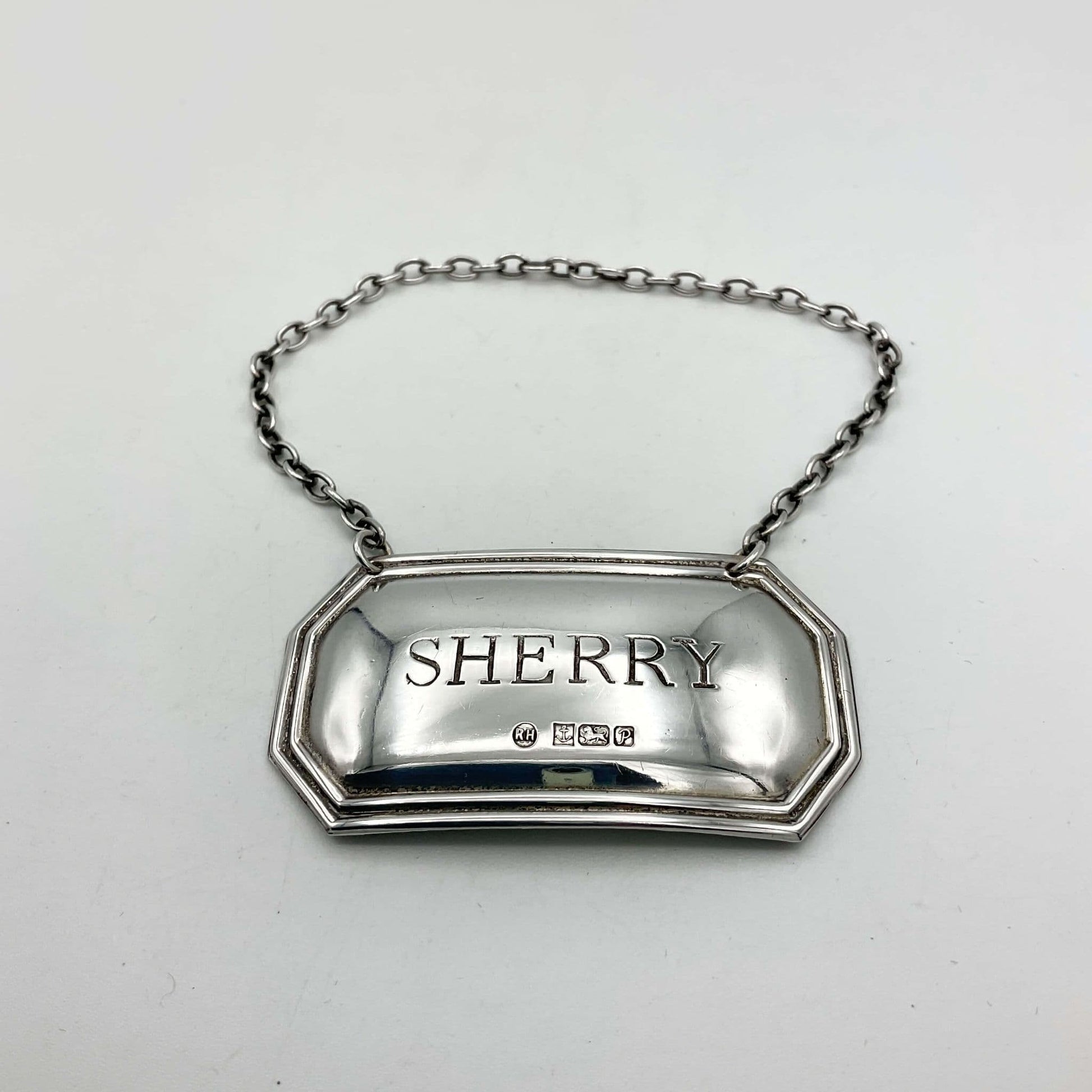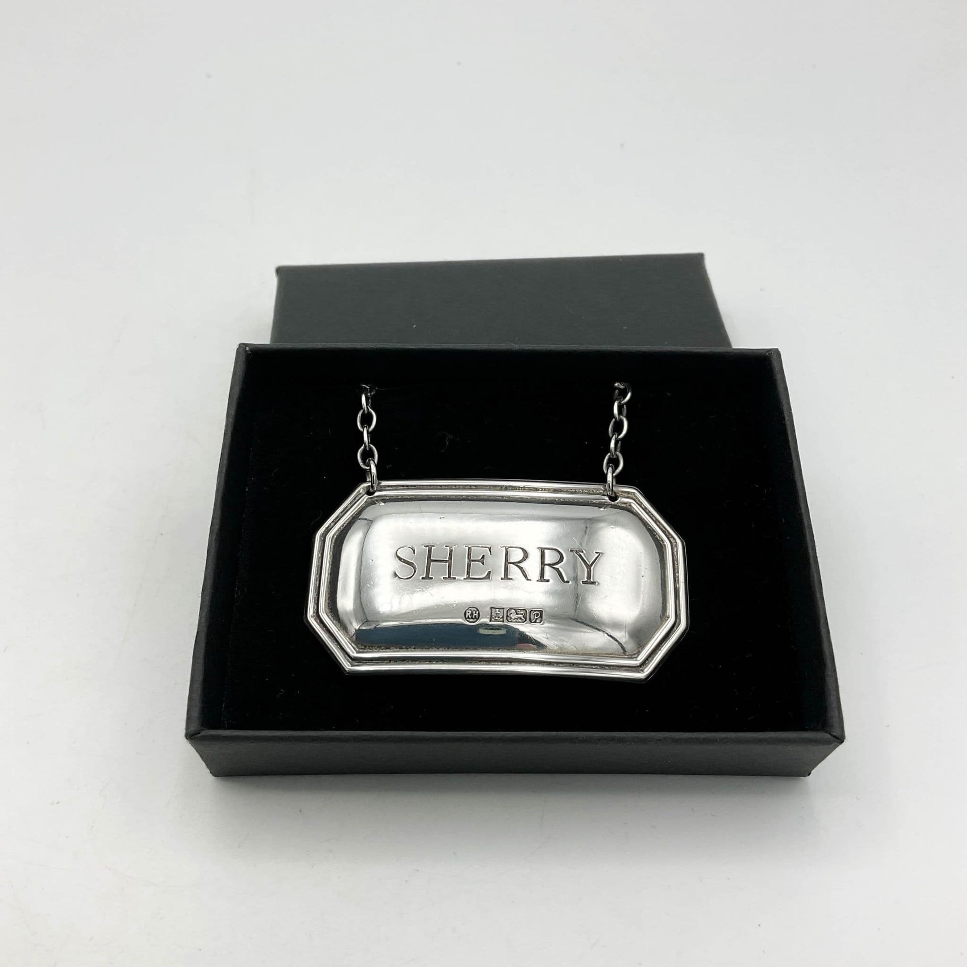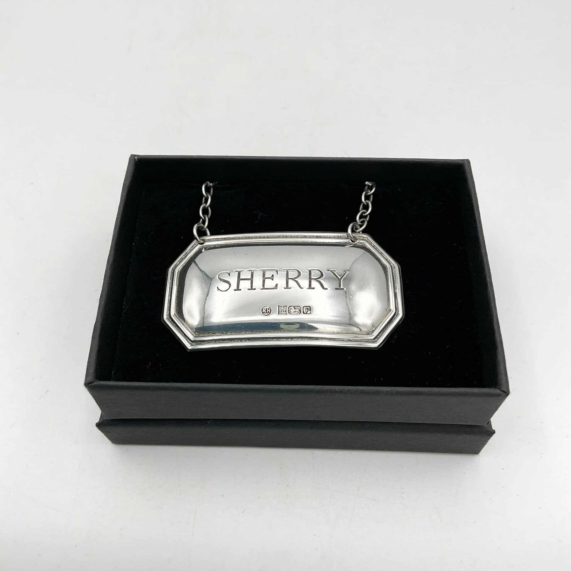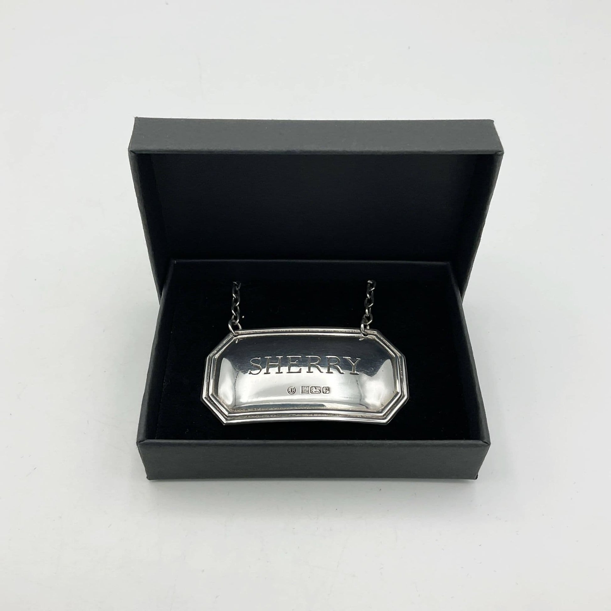 This is a lovely Sterling Silver Sherry Decanter Label in a smart black presentation box. It would make an ideal gift.