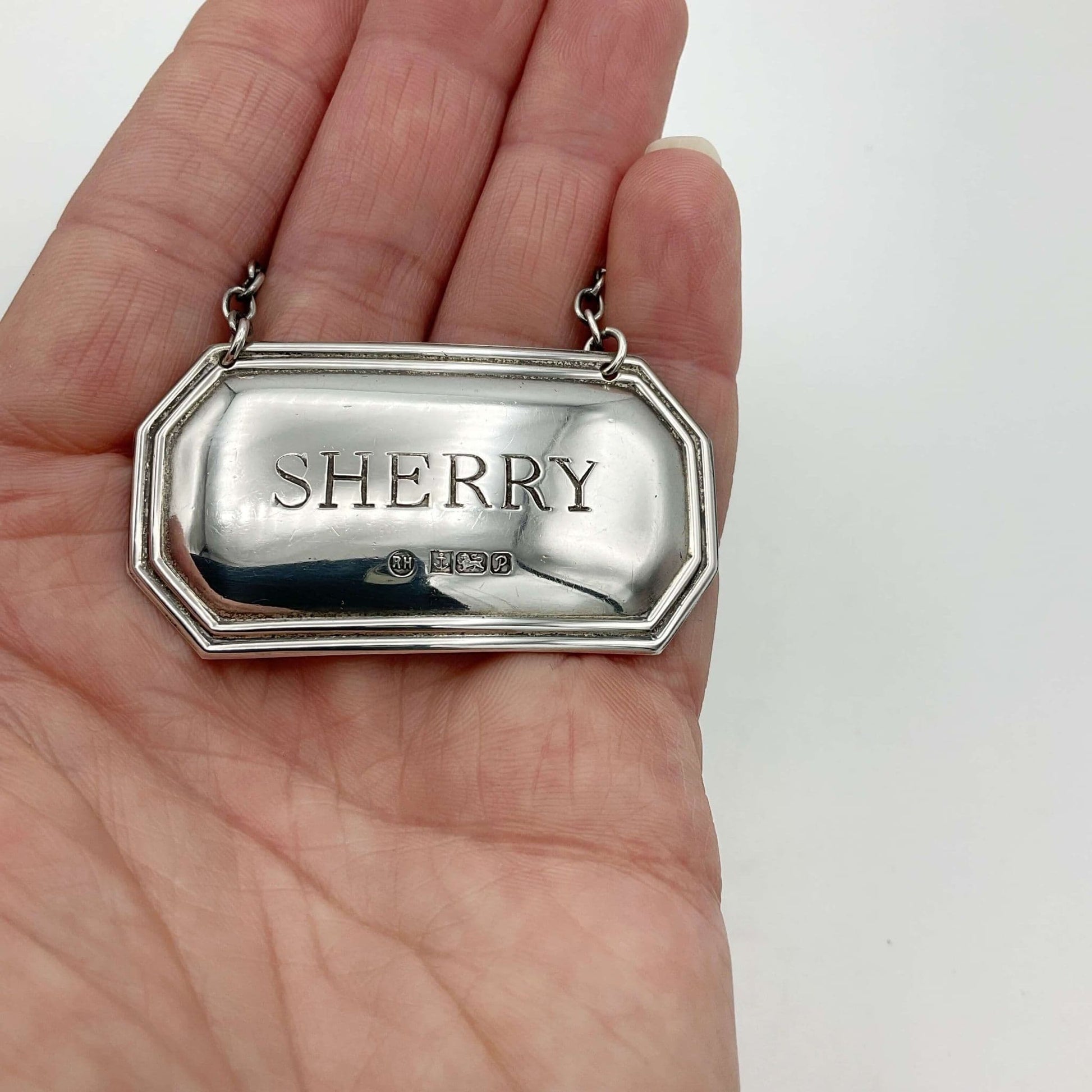 It’s made of shiny Sterling Silver and has a pretty lined design around the edge. It has Sherry engraved on it with the maker’s mark and hallmarks just below.