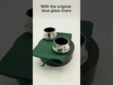They’re in good condition with the silver shiny and some tarnish spots to the outside and a bit more tarnish inside. One of the glass liners has a small chip to its outside edge which isn’t very noticeable.