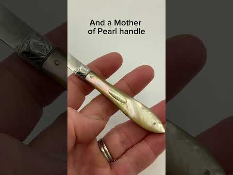 It’s in good condition with the silver shiny. There’s a bit of tarnish at the end and on one side of the collar and a tiny kink in the edge of the blade. There’s a natural inclusion on one side of the Pearl handle that can be seen in the photos. The blade protrudes when the blade is folded back into the handle. There’s are a couple of very tiny chips to the edge of the handle.