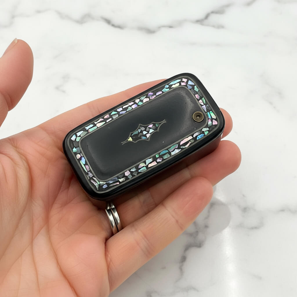 This is a pretty black lacquered Victorian Snuff Box from the early 1800s. It comes in a lovely presentation bag and would be a great gift.