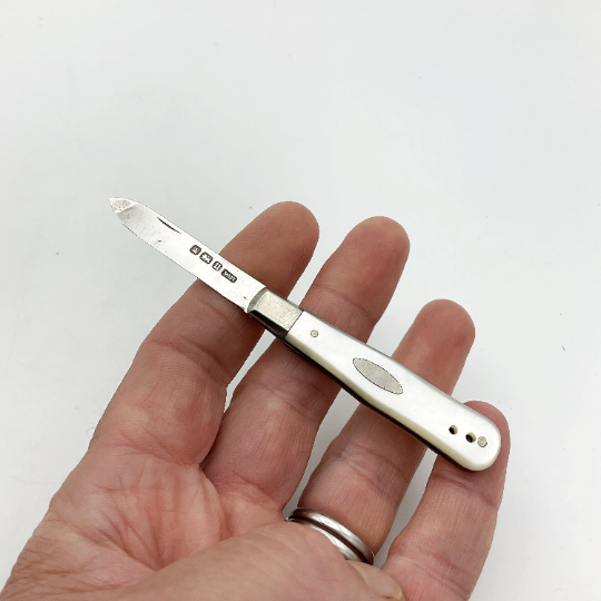 The blade is made of Sterling Silver and has the makers marks and Hallmarks on one side. The handle is made of Mother of Pearl and has a blank oval cartouche on one side.
