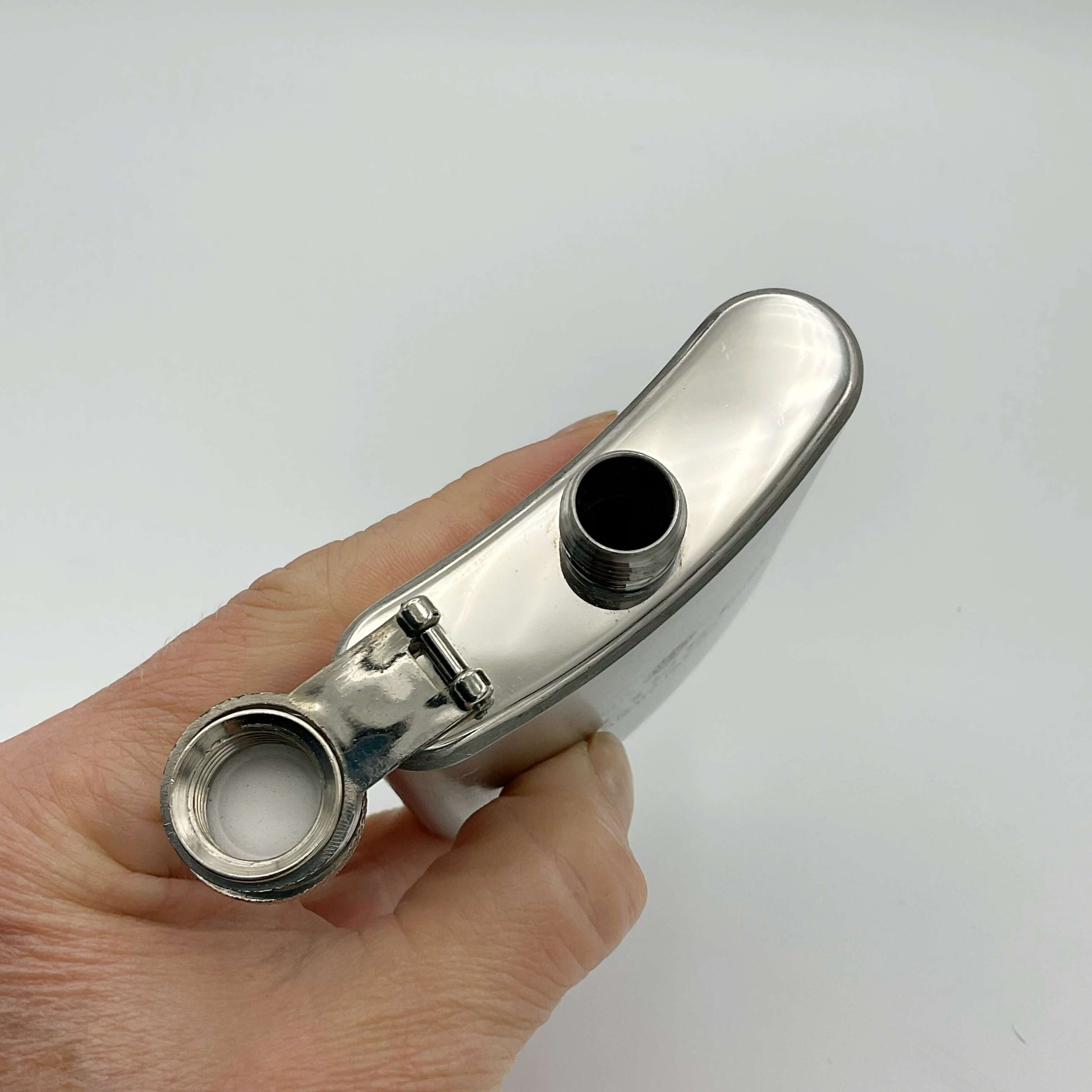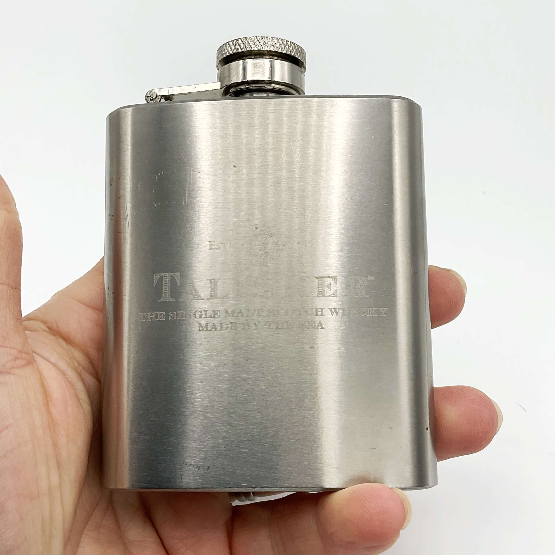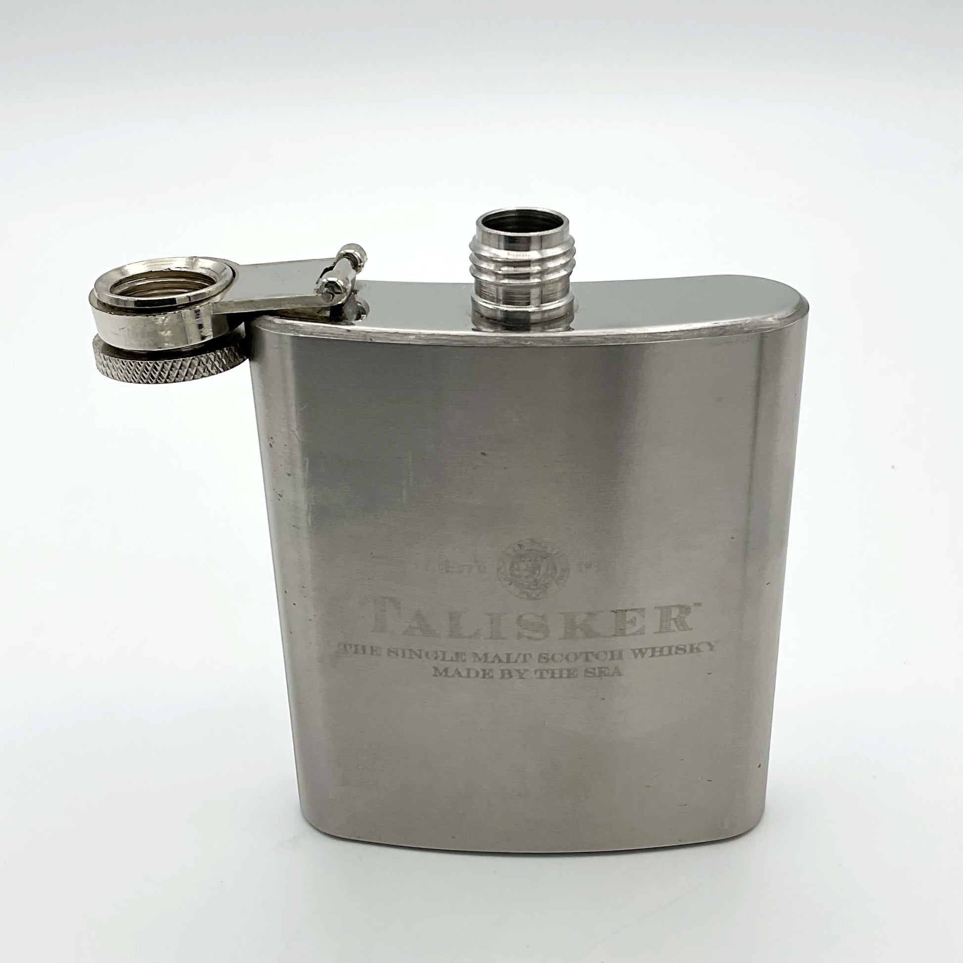It’s made of Stainless Steel and has the Talisker logo on the front with ‘The Single Malt Scotch Whisky Made by the Sea’ engraved. It has a pretty brushed design to it and a hinged screw lid.