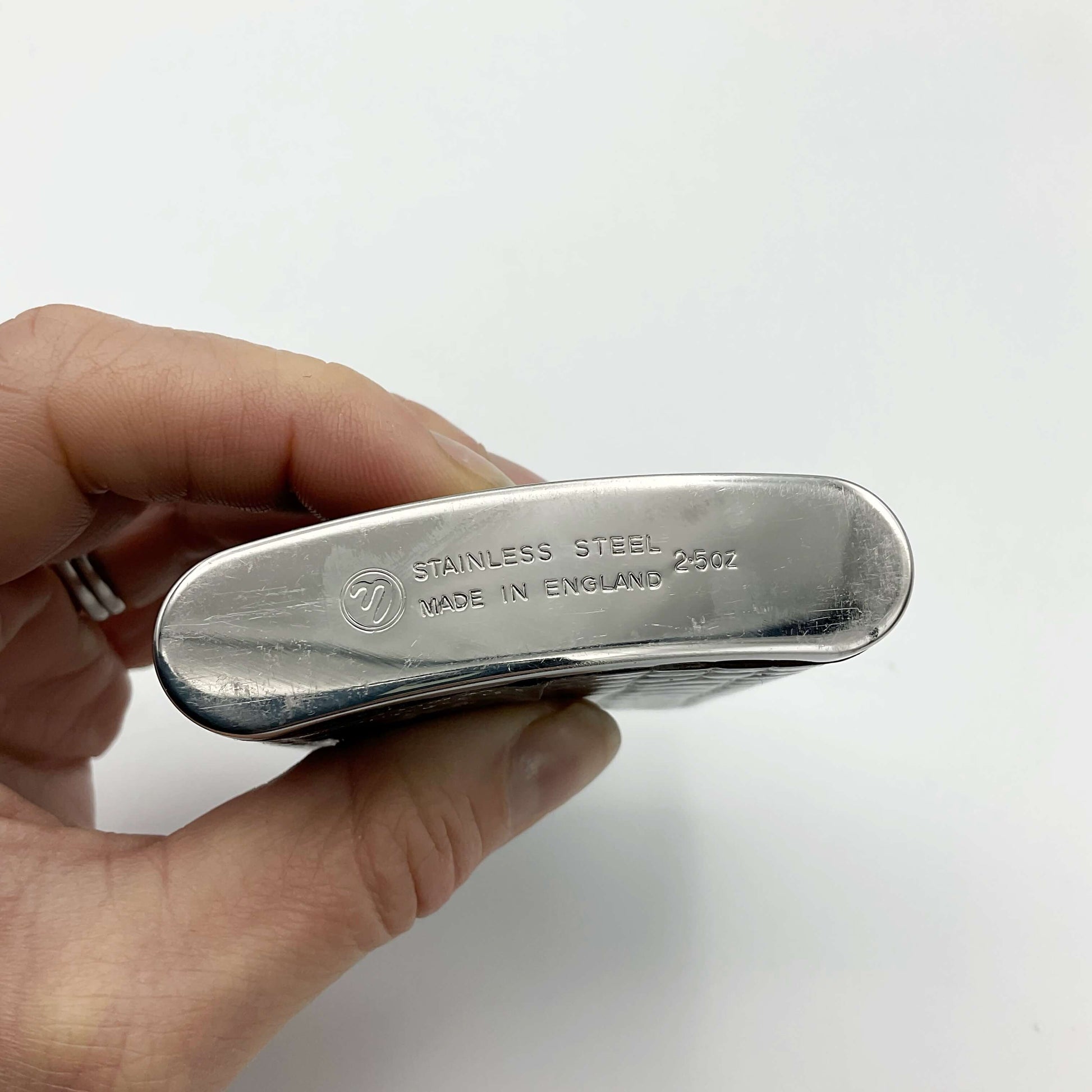 It’s a smaller size hip flask and holds 2.5oz of liquid (approx 71ml). It has a beautiful textured leather exterior and shiny Stainless Steel base, top and lid. It has Lichfield Leather and their logo stamped on the back and the base of the flask.